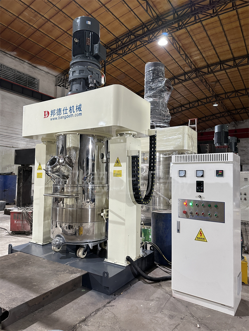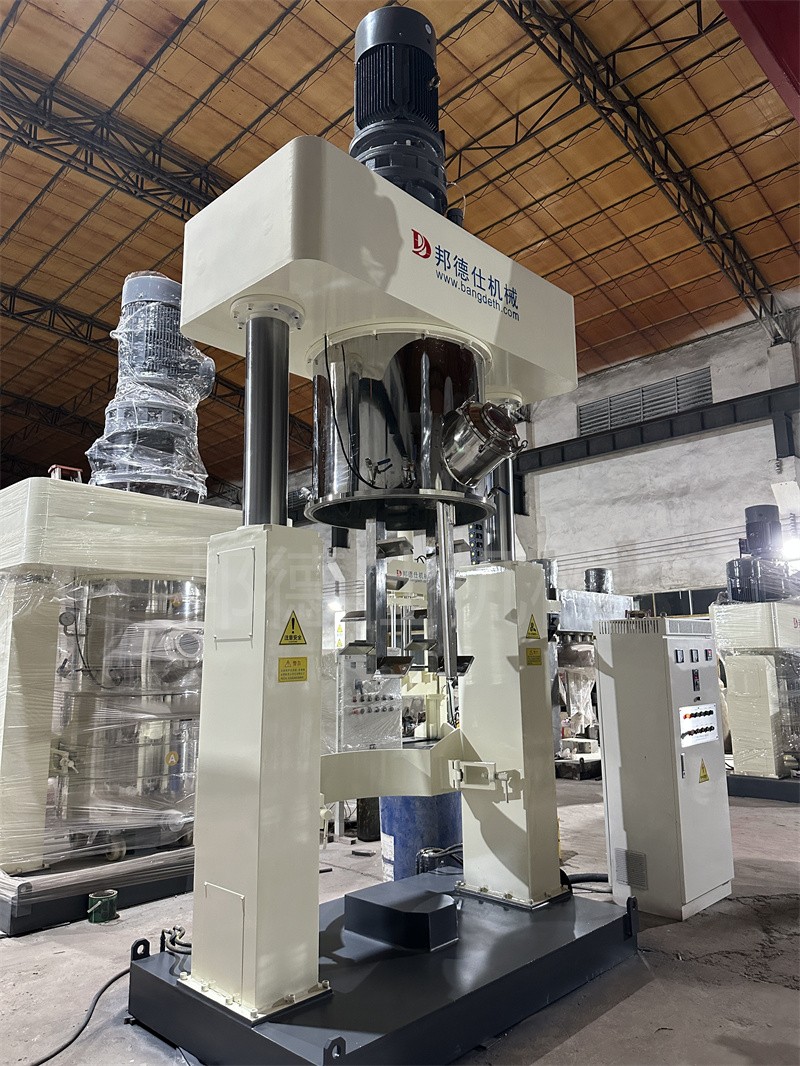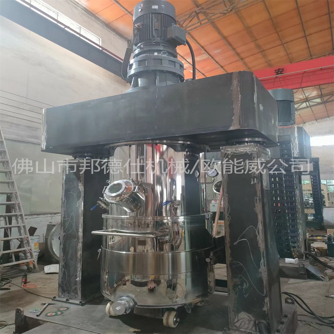 運行:設備運行狀態下,釜內有兩根或三根多層漿葉攪拌器和一至兩個自動刮刀,攪拌器在繞釜體軸線公轉的同時,又以不同的轉速繞自身軸線高速自轉,使物料在釜體內作復雜的運動,受到強烈的剪切和搓合。此外設備內的刮壁刀繞釜體軸線轉動,將粘在壁上之物料刮下參于混合,使其效果更為理想。